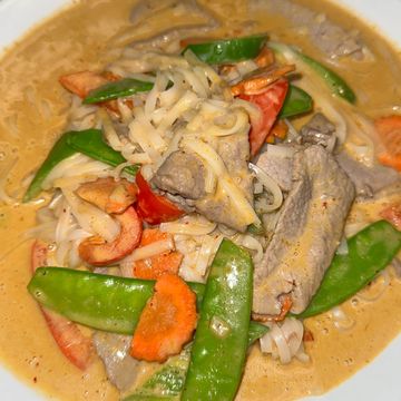 Wide rice noodles with white onions, green and red peppers, Thai curry sauce, with coconut milk and peanut sauce.