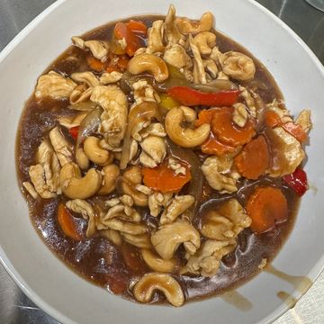 Thai cashew nuts, bell peppers, carrots and onions stir-fried in a brown sauce.