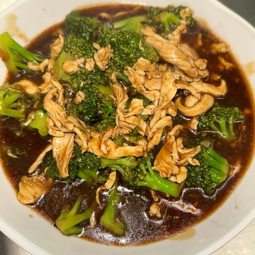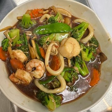 Shrimp, squid, scallops, imitation crab meat, broccoli, peapods, carrots, mushrooms, water chestnuts and bamboo strips, stir-fried with brown sauce. (DINNER PORTION ONLY)