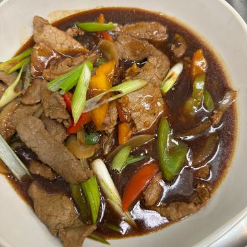 Beef, bell peppers, green onions and onions stir-fried in a brown sauce.
