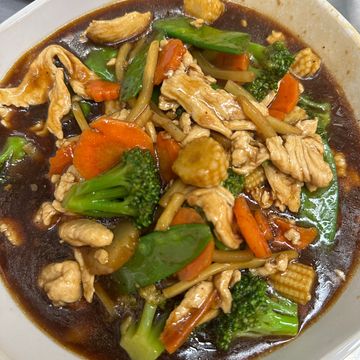 Peapods, baby corns, water chestnuts, carrots, bamboo shoots, broccoli, and mushrooms stir-fried in a brown sauce.